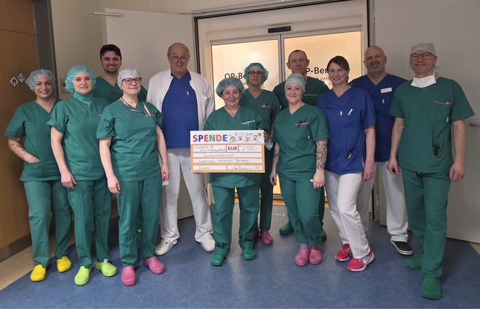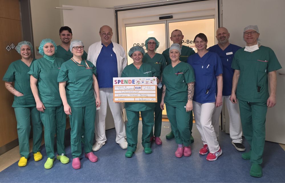 Die Mitarbeiter der Anästhesie, OP, Physiotherapie und weiteren Abteilungen an der Helios Frankenwaldklinik Kronach spenden 2.100€ an das Kinder- und Jugendhospiz.