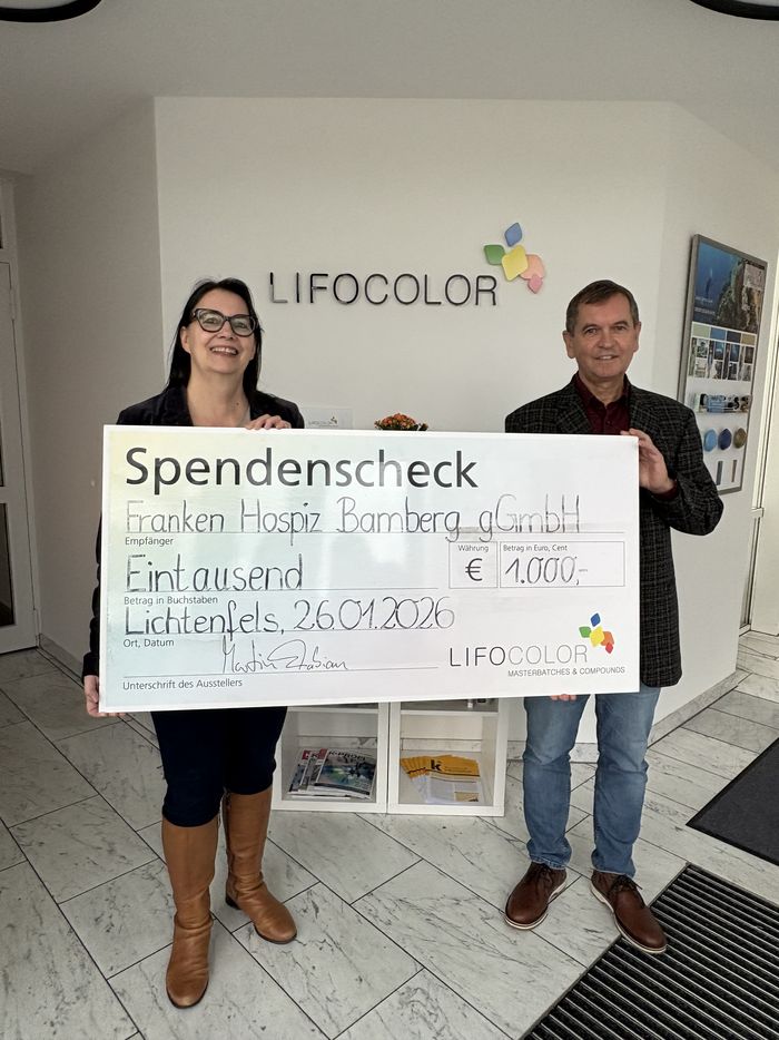 Bei einer Tombola während der Mitarbeiterweihnachtsfeier hat die Firma Lifocolor Geld gesammelt, was durch den Geschäftsführer auf 1.000€ aufgerundet wurde.
