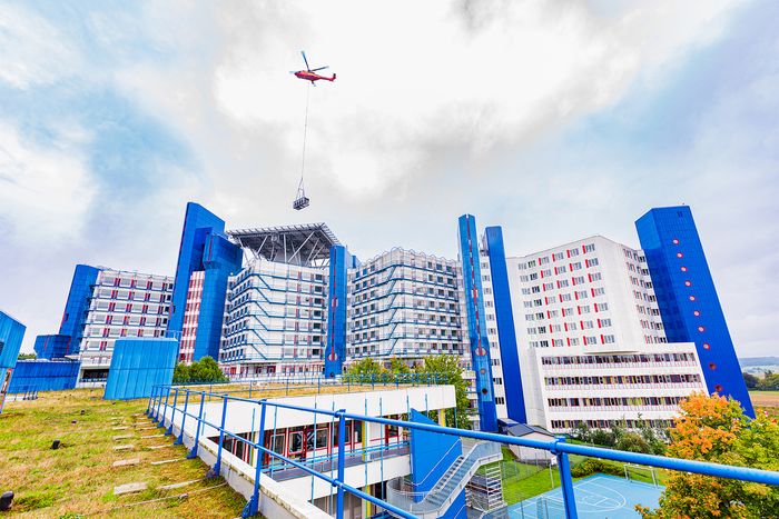 Lastenhubschrauber transportiert Material auf das Dach des Klinikums am Bruderwald