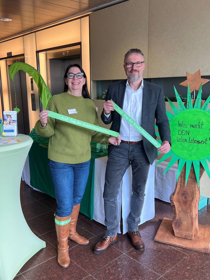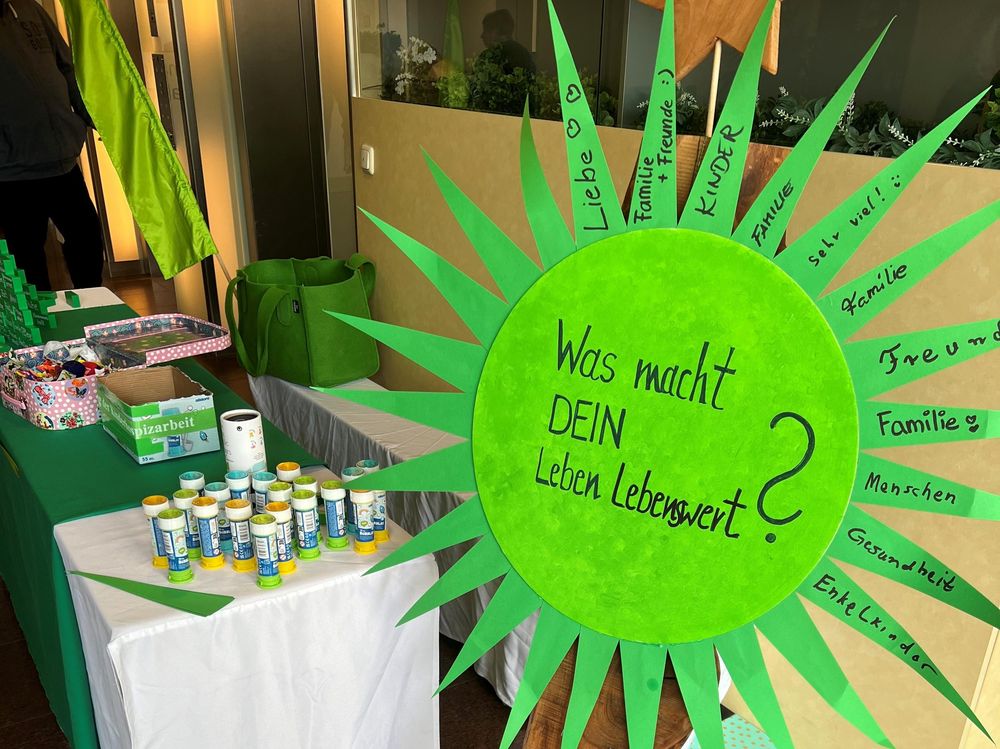 Neben Informationen über den Alltag im Kinder- und Jugendhospiz und seine Angebote erhielten die Besucherinnen und Besucher des Aktionsstandes grüne Bänder und Glitzersterne als Zeichen der Solidarität und Verbundenheit mit der Kinderhospizarbeit. Denn Grün ist die Farbe der Kinderhospizarbeit.