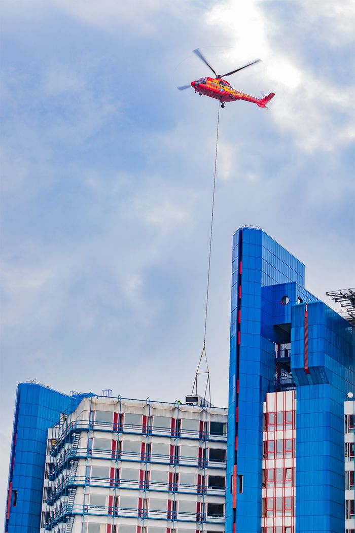 Insgesamt 7 Flüge des Lastenhubschraubers waren notwendig, um zuerst die 3 Teile einer Plattform zu transportieren und dann die Kälteanlagen, die von der Größe vergleichbar mit einem Kleinbus sind. Die Flüge fanden zwischen 10 und 12 Uhr statt und sorgten für viel Aufmerksamkeit vor Ort, da sie im Gebiet des Klinikums deutlich hör- und sichtbar waren. Die Aktion wurde unter strengen Sicherheitsvorkehrungen durchgeführt und schon Monate zuvor sorgfältig vorbereitet. Das Gebiet, über das der Hubschrauber flog, wurde den ganzen Tag großzügig abgesperrt, um die Sicherheit der Patienten, Gäste und Mitarbeiter zu wahren.